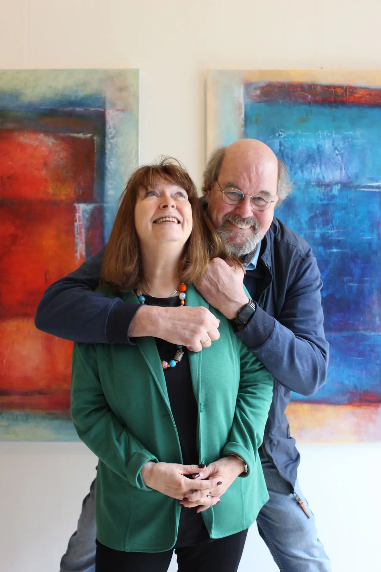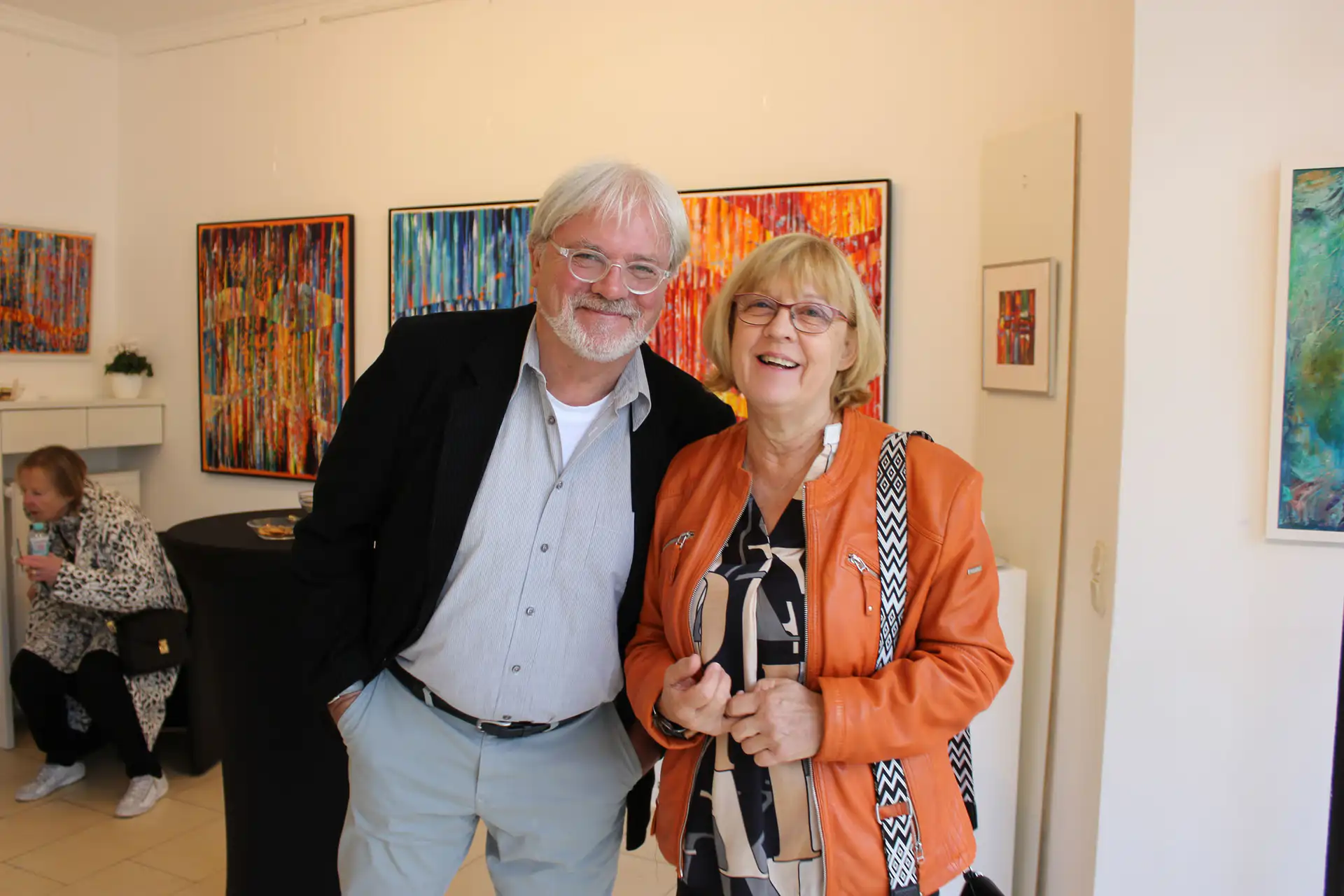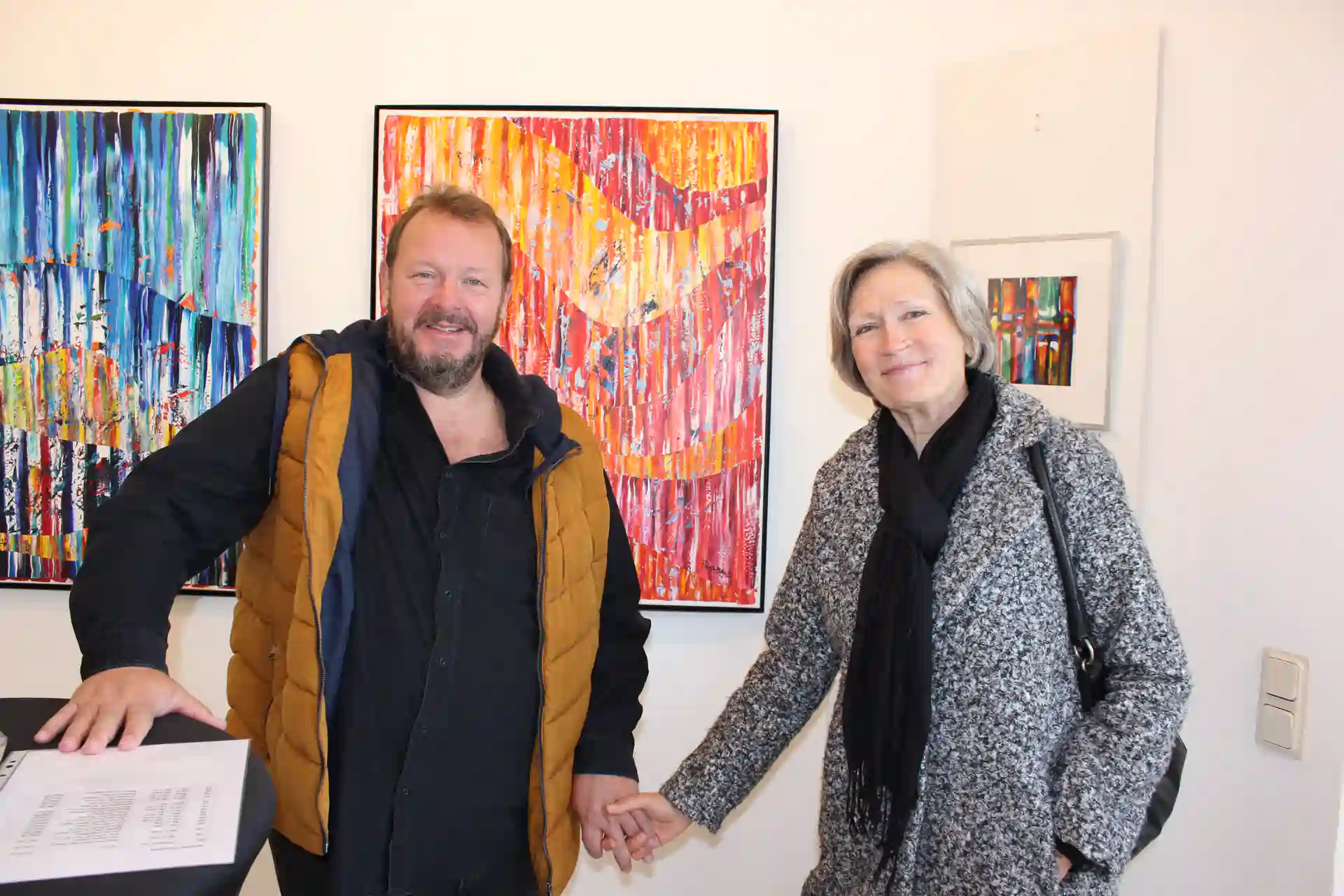 Die Entscheidung, hier zusammen eine Ausstellung zu gestalten, beruht auf vielen Gemeinsamkeiten: Sie lieben sich. Da passt das Zitat von Antoine de St.Exupéry: Entscheidend ist nicht, dass man sich ansieht, sondern dass man in die gleiche Richtung blickt. Beide lieben Farben, bunt, lebendig, leuchtend.